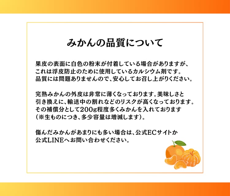 上友農園では人手をかけ、みかんひとつひとつを目視でチェックしてお客様へお届けしております。品質管理に万全を期しておりますが、商品到着時に品質劣化や破損等がございましたら商品到着後2日以内にご連絡ください。状況に応じて対応策を検討させていただきます。